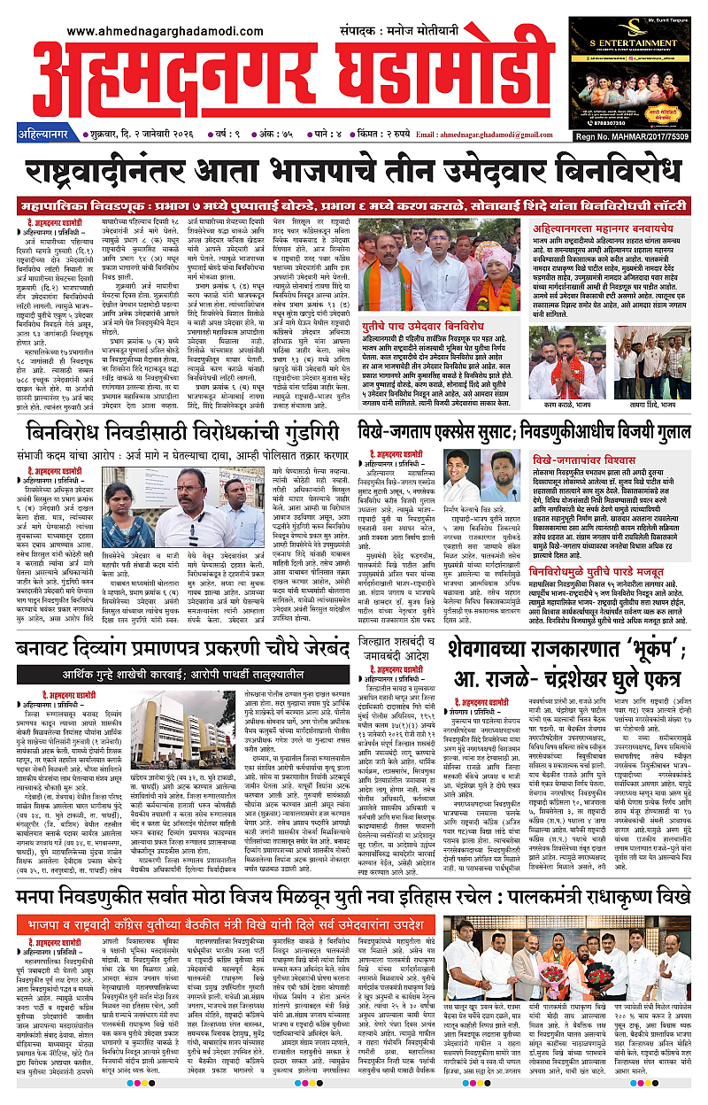 02-01-2026 January 02, 2026 02-01-2026 1 2 3 4 Page 1Page 2Page 3Page 4 × 02-01-2026 Ahmednagar Ghadamodi 02 January 2026_001Ahmednagar Ghadamodi 02 January 2026_002Ahmednagar Ghadamodi 02 January 2026_003Ahmednagar Ghadamodi 02 January 2026_004 << First << 1 >> Last >> Page no 1Page no 2Page no 3Page no 4