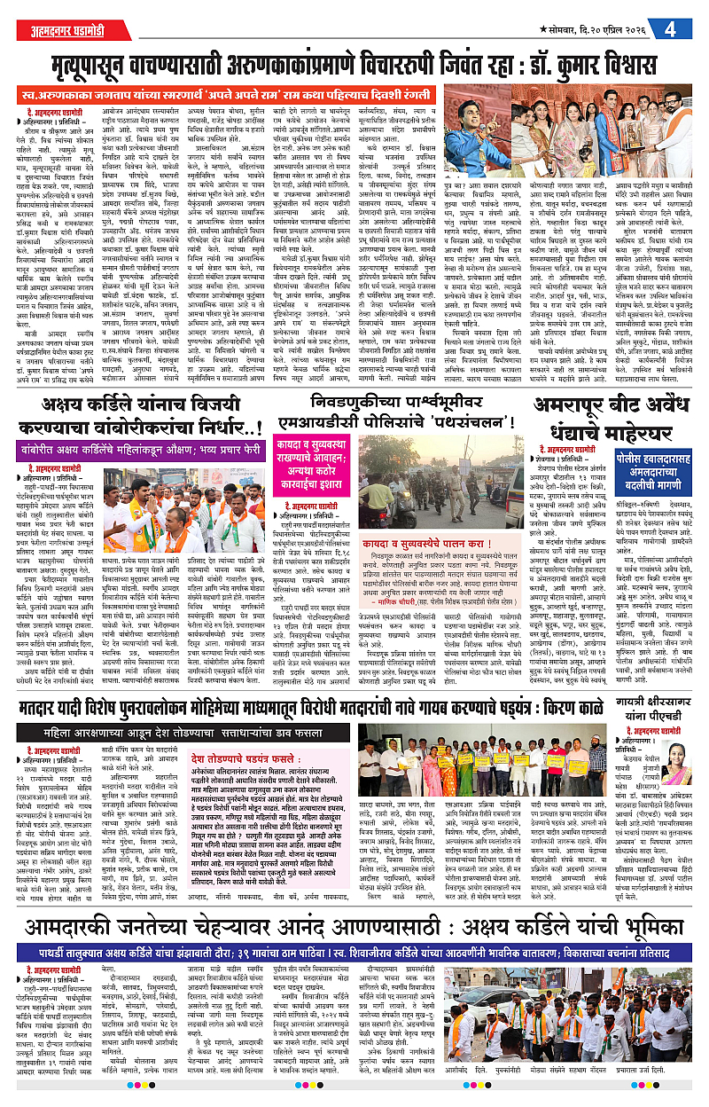 20-04-2026 Page: 4 April 20, 2026 20-04-2026 1 2 3 4 Page 1Page 2Page 3Page 4 × 20-04-2026 Ahmednagar Ghadamodi 20 April 2026_001Ahmednagar Ghadamodi 20 April 2026_002Ahmednagar Ghadamodi 20 April 2026_003Ahmednagar Ghadamodi 20 April 2026_004 << First << 4 >> Last >> Page no 1Page no 2Page no 3Page no 4